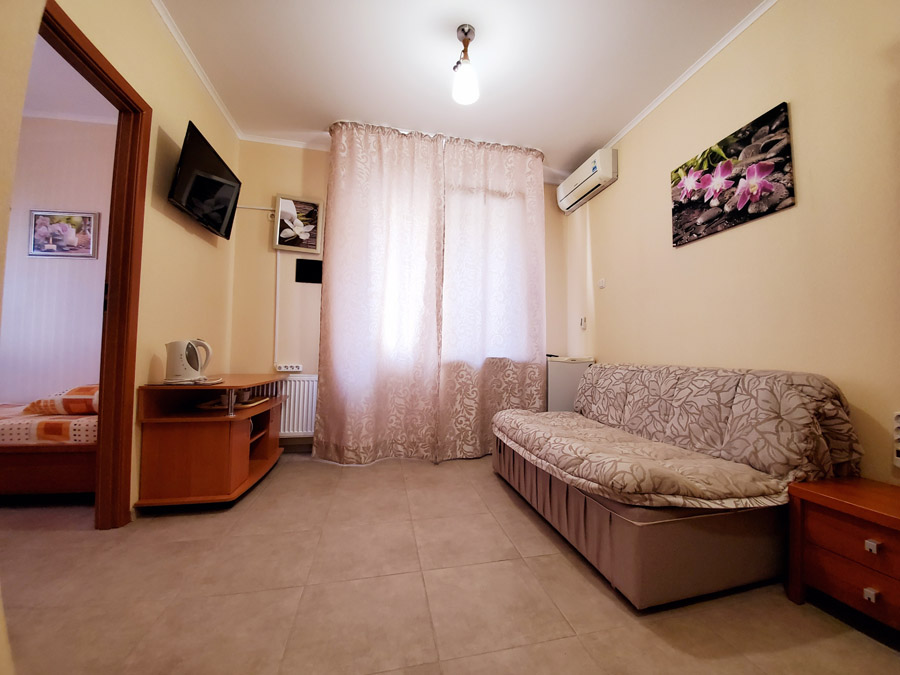 К Вашим услугам небольшой 2-комнатный номер с частичным видом на море (5 этаж), оснащенный всем необходимым для комфортного проживания.